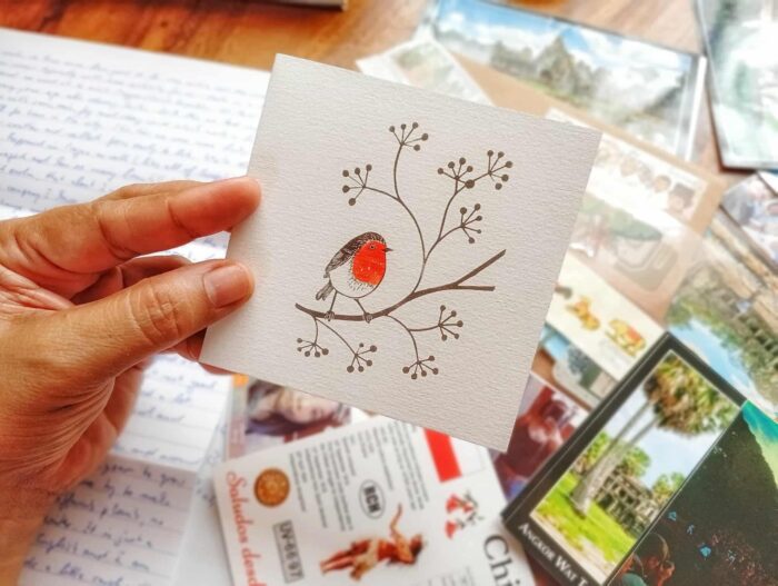 Sunday, and I’m sitting at my little kitchen table, with the rain tapping softly on the kitchen window. My morning cup lingers, postcards and pens scattered around me, a card (from my pen pal) with a tiny bird sketched on a branch catching my eye. Somehow, just holding a pen and writing a few words makes me feel a little closer to family and friends I am writing to, even those far, far away.