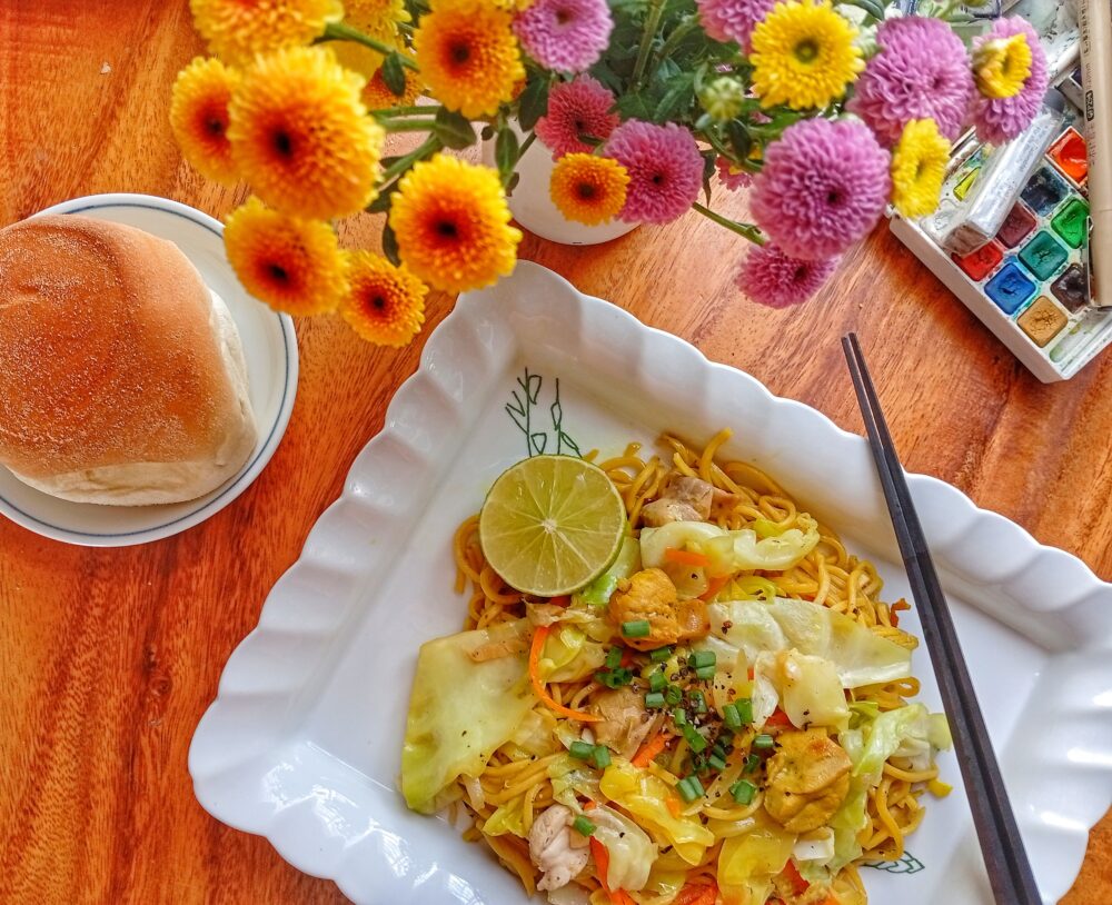 Now, my version was stripped-down — the poor (wo)man’s pancit — just a handful of chicken cut into small pieces, some cabbage, and carrots. Basic, but comforting. If my dad or brother were here, it would be a whole different affair. Their pancit canton is legendary, brimming with prawns, chicken liver, squid balls, chorizo, and even lechon belly. A fiesta in a wok. Mine, by contrast, is basic. Minimalistic (kasi fecha de peligro, iykyk…) and felt more like a quiet, comforting hug. Luckily for me, and other Filipinos here, pancit canton noodles are now sold in local stores here in Phnom Penh. I just followed the instructions on the back of the pack. Easy-peasy, no stress.